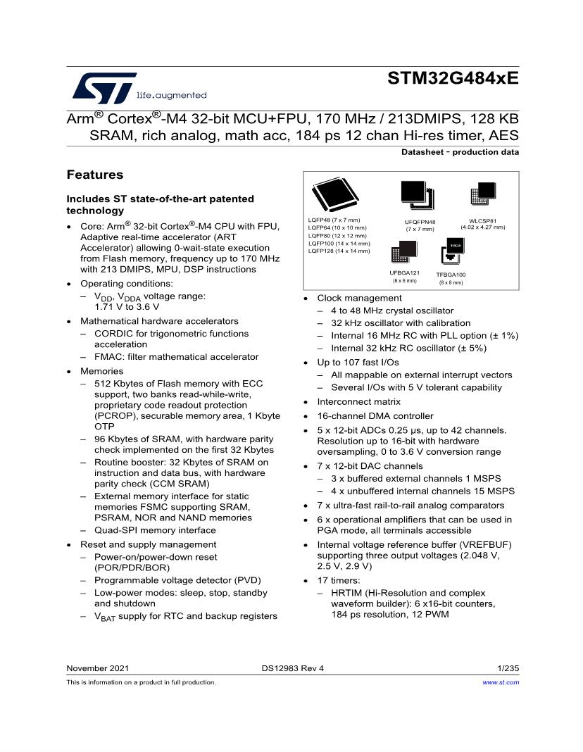 Datasheet Stm32g484xe Arm Cortex M4 32 Bit Mcu Fpu 170 Mhz 213dmips 128 Kb Sram Rich Analog Math Acc 184 Ps 12 Ch